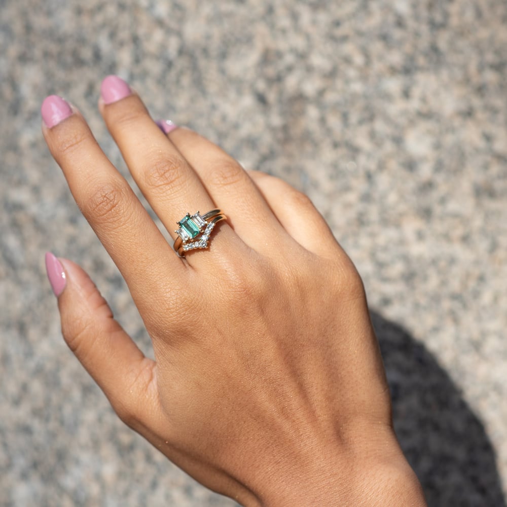This diamond set wishbone pairs perfectly with our baguette trio ring.